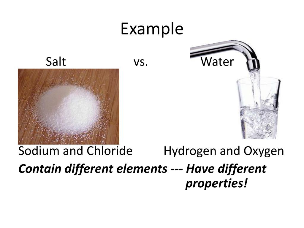 Example Salt vs. Water Sodium and Chloride Hydrogen and Oxygen Contain different elements --- Have different properties!