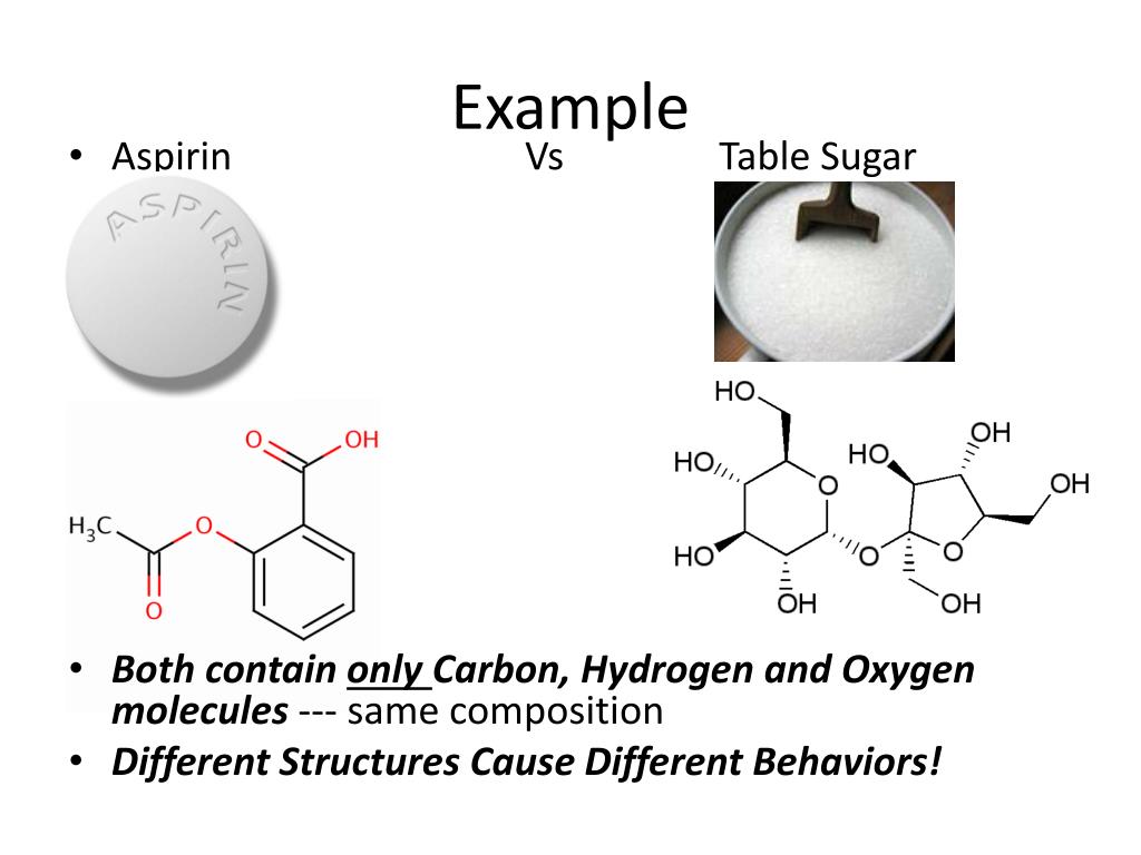 Example • Aspirin Vs Table Sugar • Both contain only Carbon, Hydrogen and Oxygen molecules --- same composition • Different Structures Cause Different Behaviors!