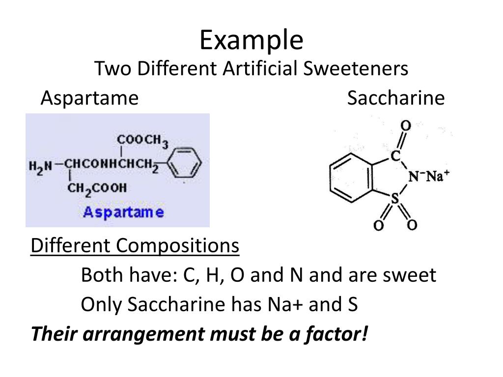 Example Two Different Artificial Sweeteners Aspartame Saccharine Different Compositions Both have: C, H, O and N and are sweet Only Saccharine has Na+ and S Their arrangement must be a factor!