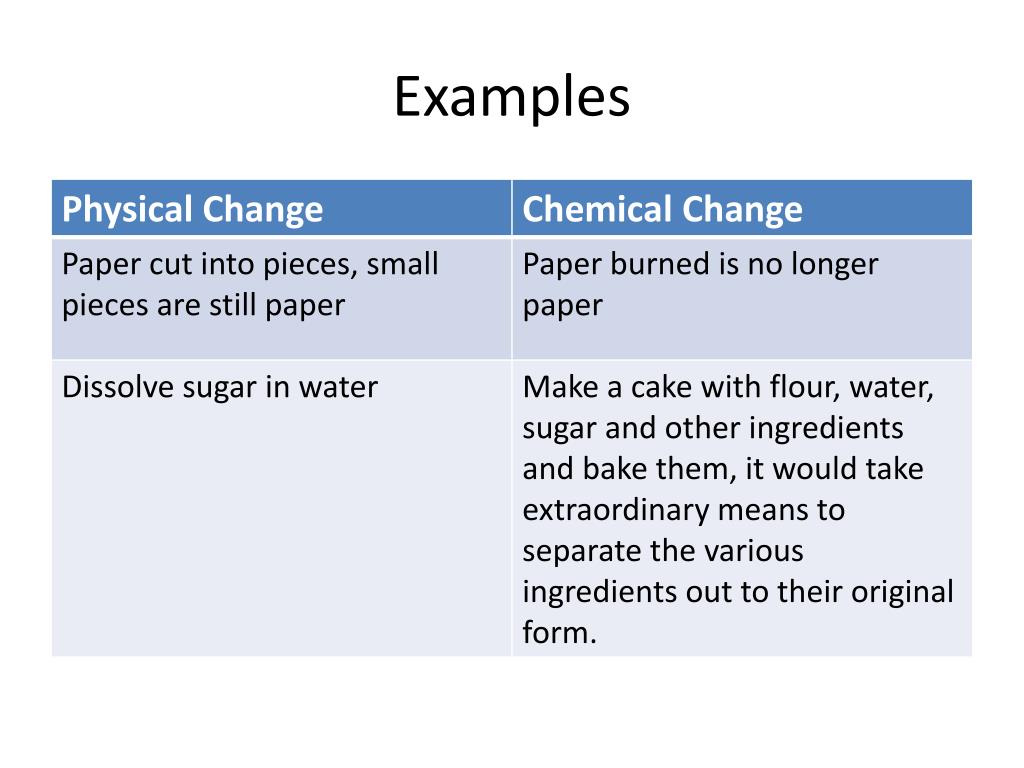 Chemical properties vs. Physical properties • Chemical Property • Flammability: The ability to burn • Ability to rust:Reacts with oxygen to produce rust • Reactivity with vinegar: Reacts with vinegar to produce new substances • Physical Property • Transparency: The property of letting light pass through something • Boiling point: Temperature at which a substance goes from liquid to gas • Melting point: Temperature at which a substance goes from solid to a liquid • Brittleness: Tendency to crack or break • Ductility: Ability to bend without breaking • Elasticity: Ability to be stretched or compressed then return to original size • Density: Mass per unit volume