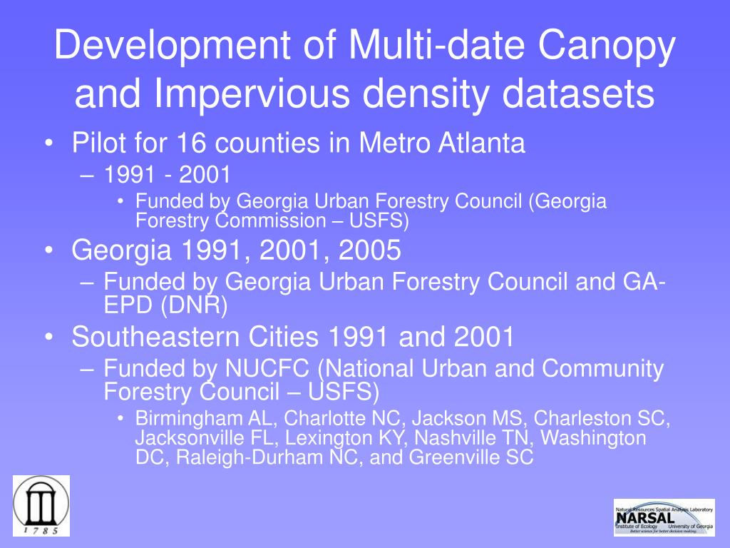Development of Multi-date Canopy and Impervious density datasets • Pilot for 16 counties in Metro Atlanta • 1991 - 2001 • Funded by Georgia Urban Forestry Council (Georgia Forestry Commission – USFS) • Georgia 1991, 2001, 2005 • Funded by Georgia Urban Forestry Council and GA-EPD (DNR) • Southeastern Cities 1991 and 2001 • Funded by NUCFC (National Urban and Community Forestry Council – USFS) • Birmingham AL, Charlotte NC, Jackson MS, Charleston SC, Jacksonville FL, Lexington KY, Nashville TN, Washington DC, Raleigh-Durham NC, and Greenville SC