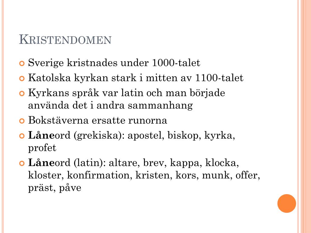 Kristendomen • Sverige kristnades under 1000-talet • Katolska kyrkan stark i mitten av 1100-talet • Kyrkans språk var latin och man började använda det i andra sammanhang • Bokstäverna ersatte runorna • Låneord (grekiska): apostel, biskop, kyrka, profet • Låneord (latin): altare, brev, kappa, klocka, kloster, konfirmation, kristen, kors, munk, offer, präst, påve