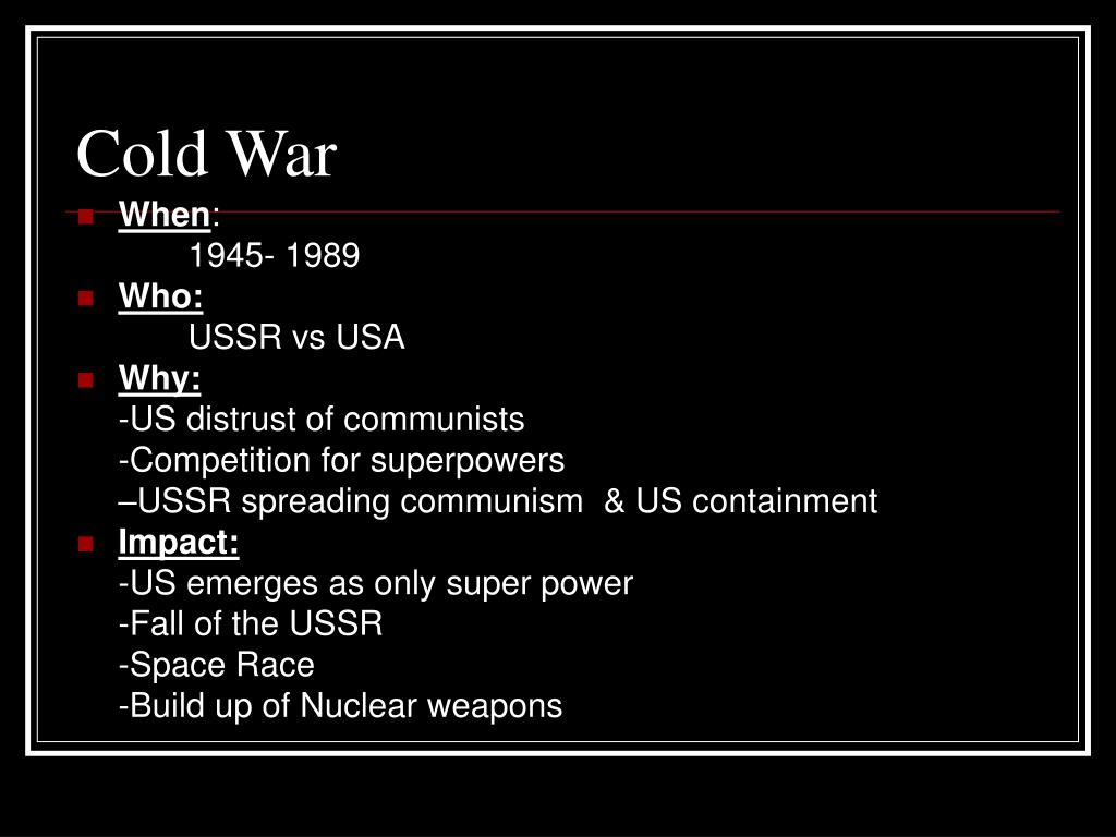 Cold War • When: 1945- 1989 • Who: USSR vs USA • Why: -US distrust of communists -Competition for superpowers –USSR spreading communism & US containment • Impact: -US emerges as only super power -Fall of the USSR -Space Race -Build up of Nuclear weapons