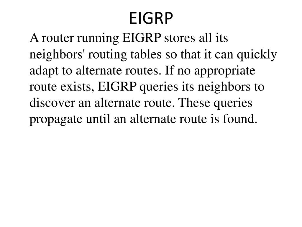 EIGRP A router running EIGRP stores all its neighbors' routing tables so that it can quickly adapt to alternate routes. If no appropriate route exists, EIGRP queries its neighbors to discover an alternate route. These queries propagate until an alternate route is found.