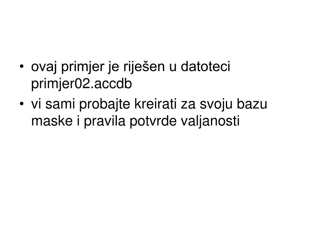 ovaj primjer je riješen u datoteci primjer02.accdb • vi sami probajte kreirati za svoju bazu maske i pravila potvrde valjanosti