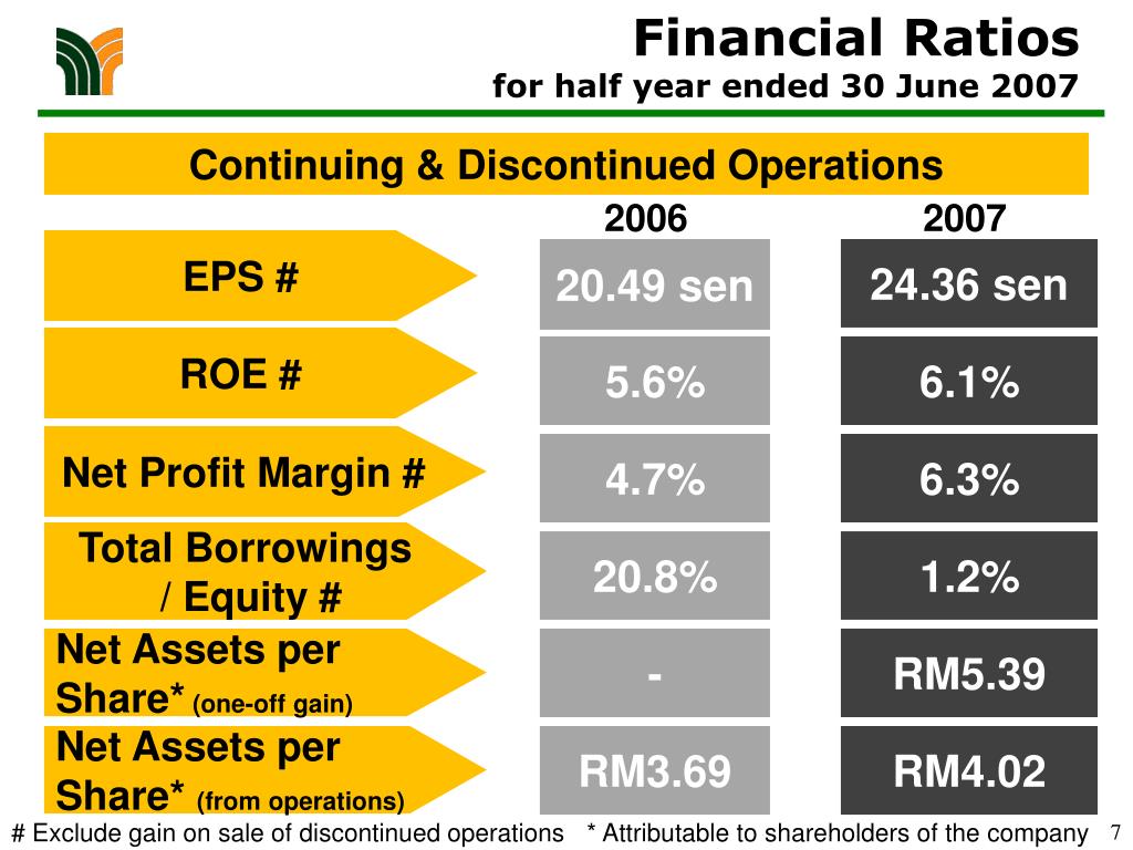 Financial Ratios for half year ended 30 June 2007 Continuing & Discontinued Operations 2006 2007 EPS # 20.49 sen 24.36 sen ROE # 5.6% 6.1% Net Profit Margin # 4.7% 6.3% Total Borrowings / Equity # 20.8% 1.2% Net Assets per Share*(one-off gain) - RM5.39 Net Assets per Share* (from operations) RM3.69 RM4.02 # Exclude gain on sale of discontinued operations * Attributable to shareholders of the company