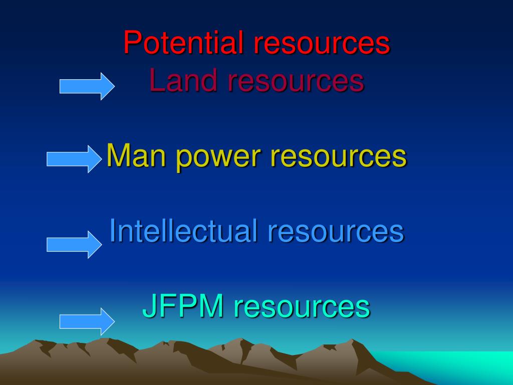 Potential resources Land resourcesMan power resourcesIntellectual resourcesJFPM resources