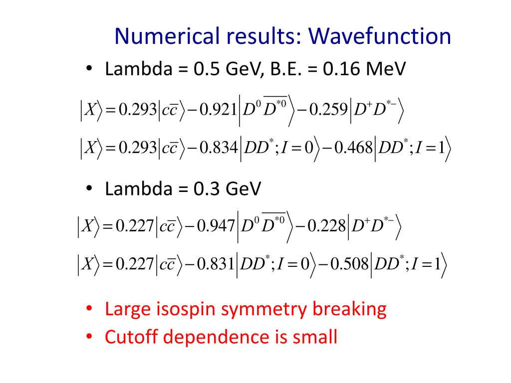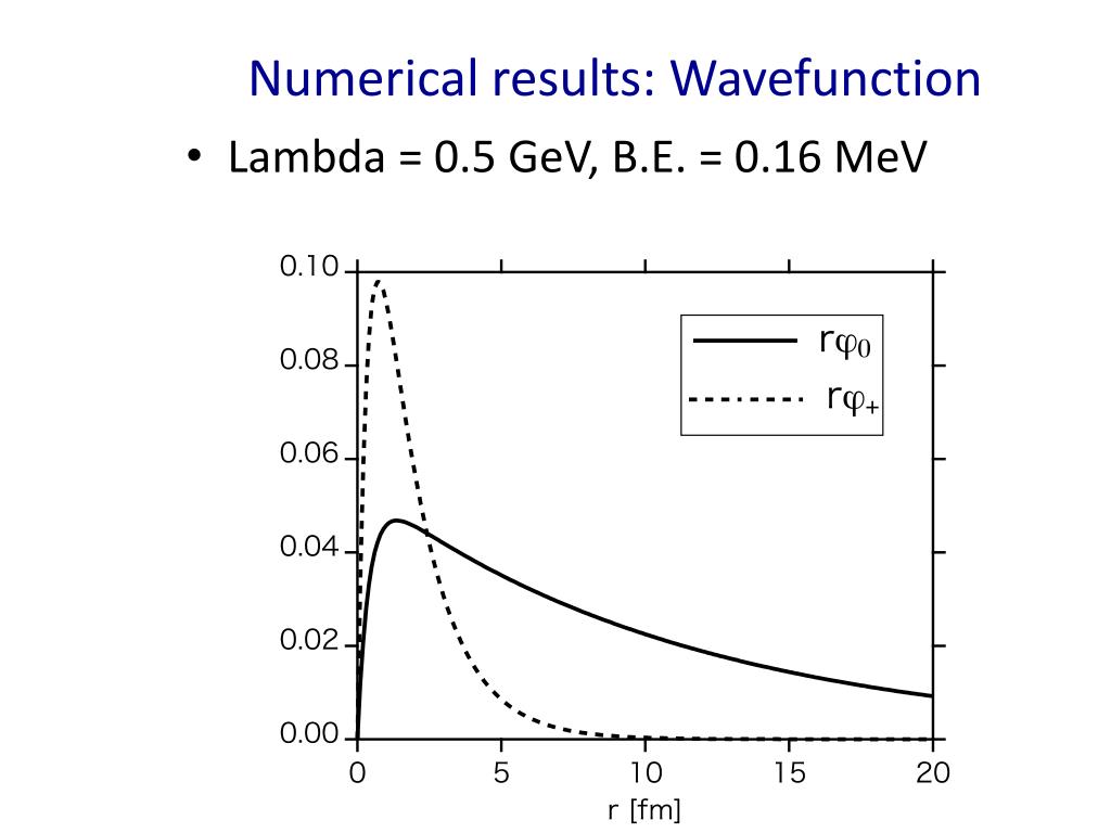 Numerical results: Wavefunction • Lambda = 0.5 GeV, B.E. = 0.16 MeV • Lambda = 0.3 GeV • Large isospin symmetry breaking • Cutoff dependence is small