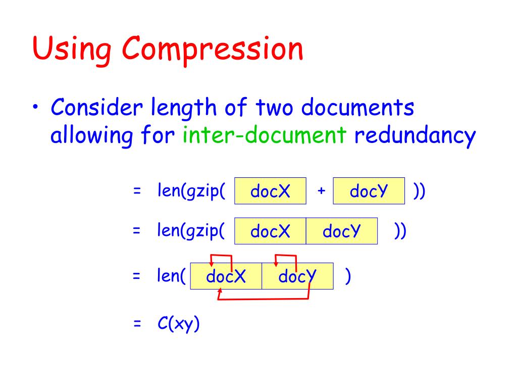 = len(gzip( )) + len(gzip( )) docX docY = len( ) + len( ) docX docY Using Compression • Consider length of two documents not allowing for inter-document redundancy = C(x) + C(y)