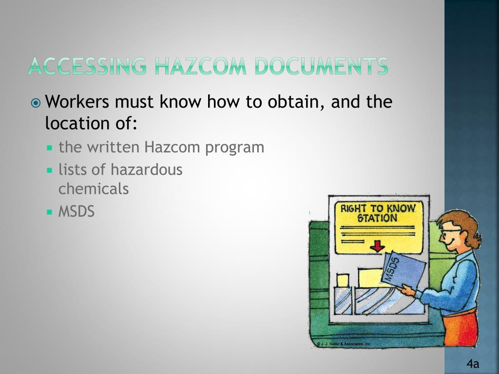 Accessing Hazcom documents • Workers must know how to obtain, and the location of: • the written Hazcom program • lists of hazardous chemicals • MSDS 4a