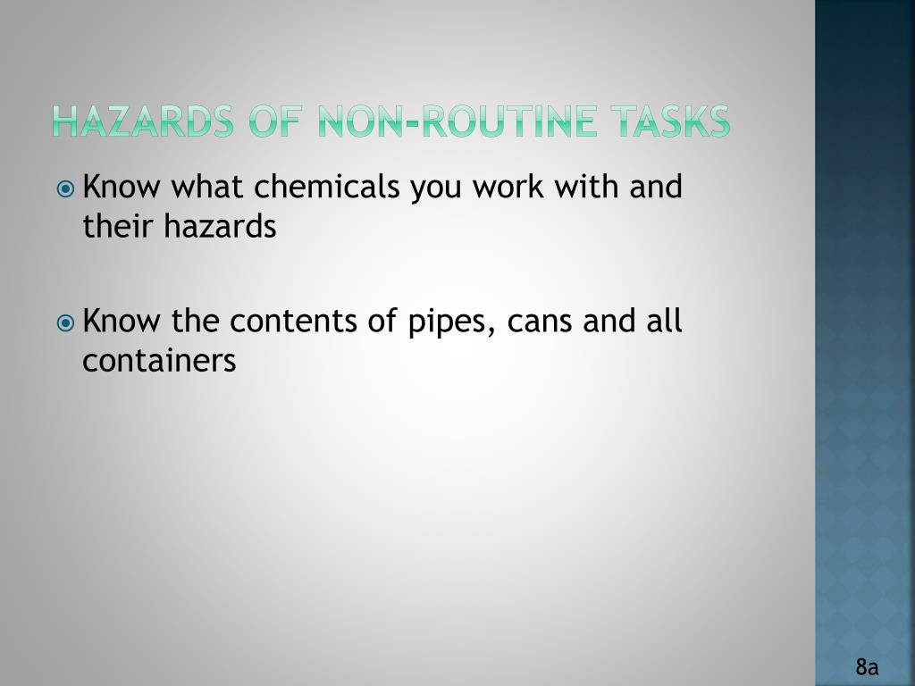 Hazards of non-routine tasks • Know what chemicals you work with and their hazards • Know the contents of pipes, cans and all containers 8a