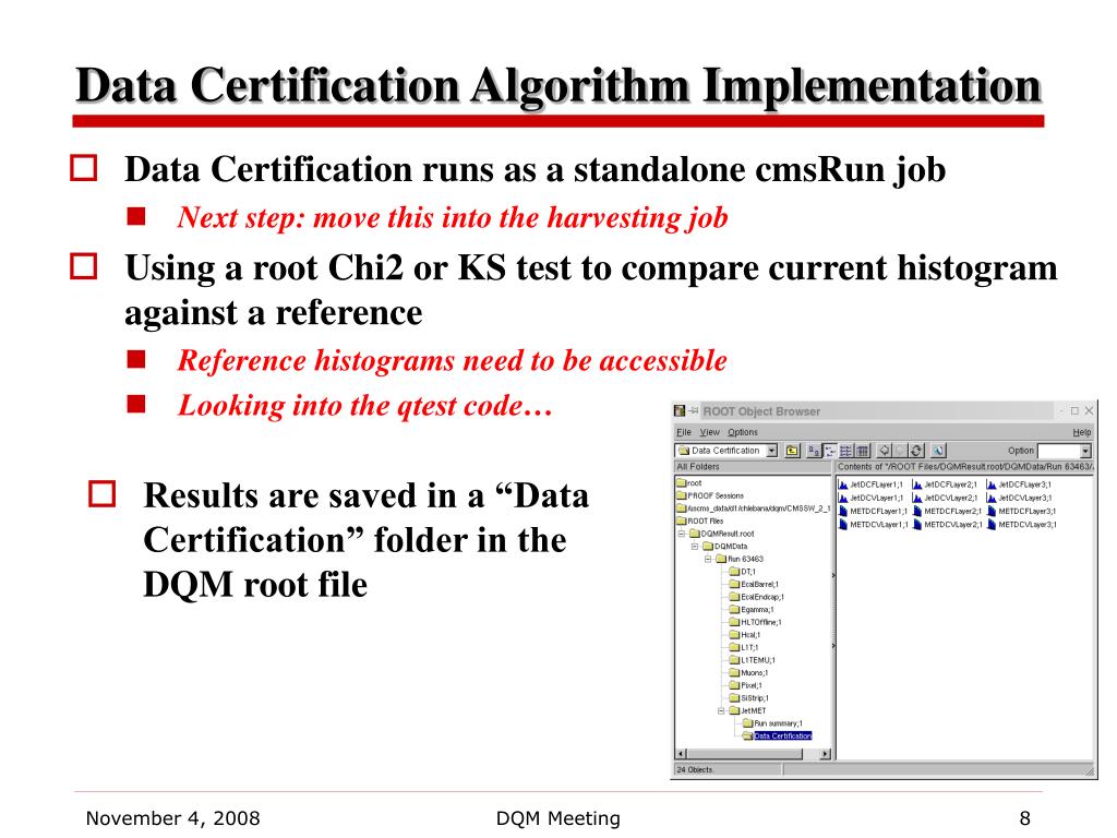 Data Certification runs as a standalone cmsRun job Next step: move this into the harvesting job Using a root Chi2 or KS test to compare current histogram against a reference Reference histograms need to be accessible Looking into the qtest code… Results are saved in a “Data Certification” folder in the DQM root file Data Certification Algorithm Implementation DQM Meeting