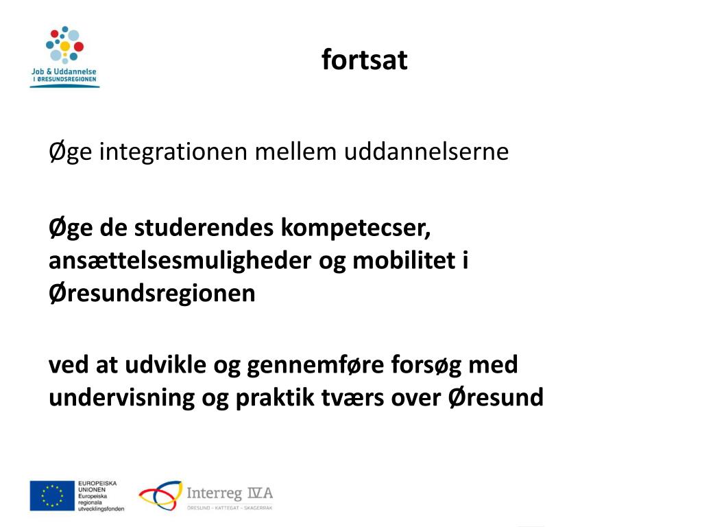 fortsat Øge integrationen mellem uddannelserne Øge de studerendes kompetecser, ansættelsesmuligheder og mobilitet i Øresundsregionen ved at udvikle og gennemføre forsøg med undervisning og praktik tværs over Øresund