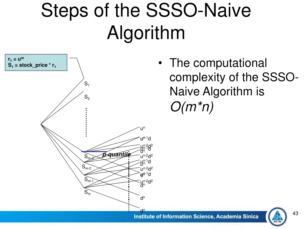 Steps of the SSSO-Naive Algorithm • The computational complexity of the SSSO-Naive Algorithm is O(m*n) r1 = um S1 = stock_price * r1 S1 S2 …………… un un-1d un un-2d2 un-1d un p-quantile ……. Sm-3 un-2d2 un-1d ……. un Sm-2 ……. un-2d2 un-1d dn ……. ……. Sm-1 un-2d2 dn ……. ……. Sm dn ……. dn