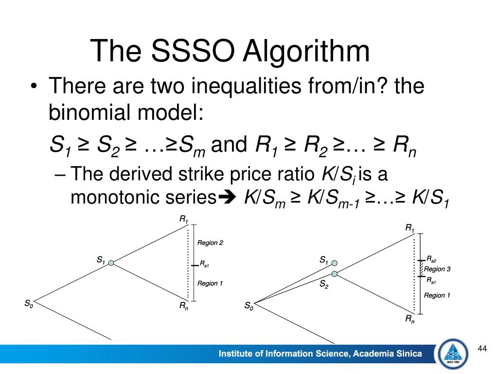 The SSSO Algorithm • There are two inequalities from/in? the binomial model: • S1≥ S2≥ …≥Smand R1≥ R2≥… ≥ Rn • The derived strike price ratio K/Si is a monotonic seriesK/Sm ≥ K/Sm-1 ≥…≥ K/S1