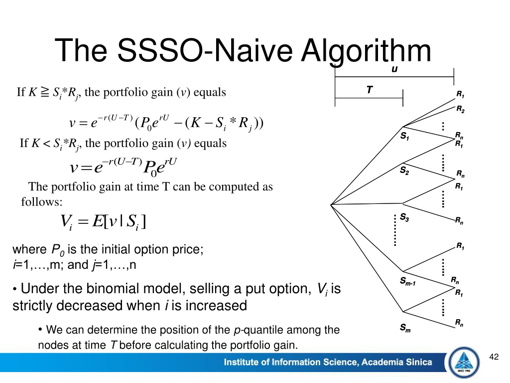The SSSO-Naive Algorithm If K ≧ Si*Rj, the portfolio gain (v) equals If K < Si*Rj, the portfolio gain (v) equals The portfolio gain at time T can be computed as follows: where P0is the initial option price; i=1,…,m; and j=1,…,n • Under the binomial model, selling a put option, Vi is strictly decreased when iis increased • We can determine the position of the p-quantile among the nodes at time T before calculating the portfolio gain.