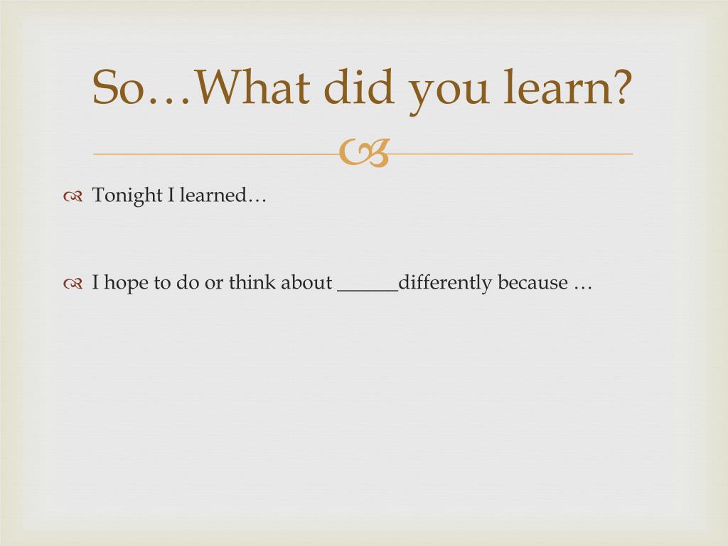 So…What did you learn? • Tonight I learned… • I hope to do or think about ______differently because …