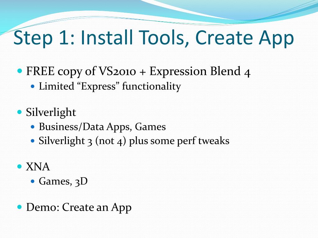 Step 1: Install Tools, Create App • FREE copy of VS2010 + Expression Blend 4 • Limited “Express” functionality • Silverlight • Business/Data Apps, Games • Silverlight 3 (not 4) plus some perf tweaks • XNA • Games, 3D • Demo: Create an App