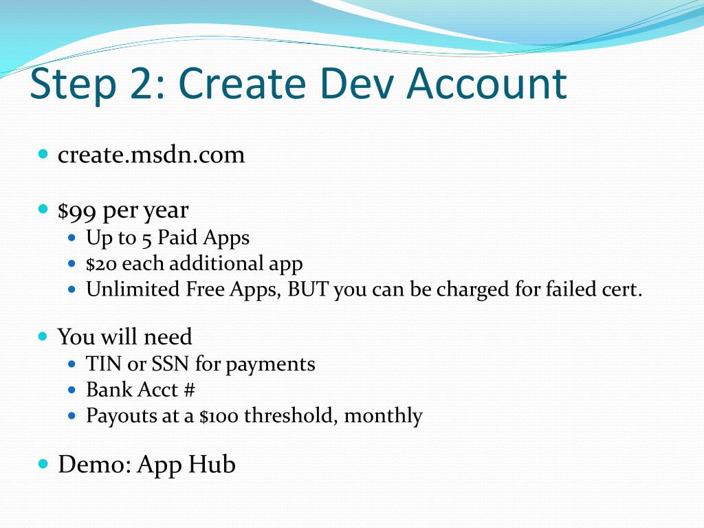 Step 2: Create Dev Account • create.msdn.com • $99 per year • Up to 5 Paid Apps • $20 each additional app • Unlimited Free Apps, BUT you can be charged for failed cert. • You will need • TIN or SSN for payments • Bank Acct # • Payouts at a $100 threshold, monthly • Demo: App Hub