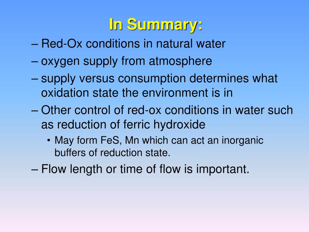 In Summary: • Red-Ox conditions in natural water • oxygen supply from atmosphere • supply versus consumption determines what oxidation state the environment is in • Other control of red-ox conditions in water such as reduction of ferric hydroxide • May form FeS, Mn which can act an inorganic buffers of reduction state. • Flow length or time of flow is important.