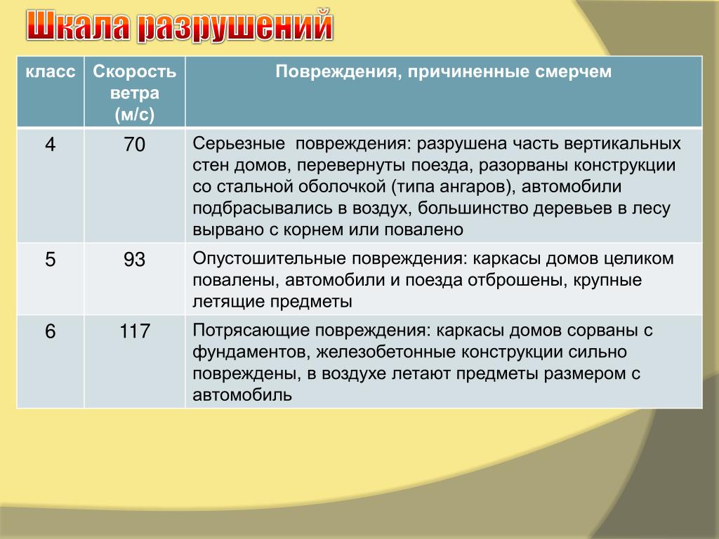 Примеры Июль 1984 г.- смерч, зародившийся на северо-западе Москвы, прошёл почти до Вологды. Ширина пути разрушений достигала при этом 300-500 м. 30 мая 1879 г. - близ городка Рэндолф в 4ч дня 15 мин в себя всё всасывали 2 смерча, которые двигались к Рэндолфу. Эта катастрофа была очень разрушительной. 1985 г. – смерч огромной силы возник в 15 км южнее Иванова и прошёл около 100 км, вышел к Волге и затих в лесах близ Костромы. Более 20 человек погибло. Многие получили ранения. Деревья вырывало с корнем и ломало.