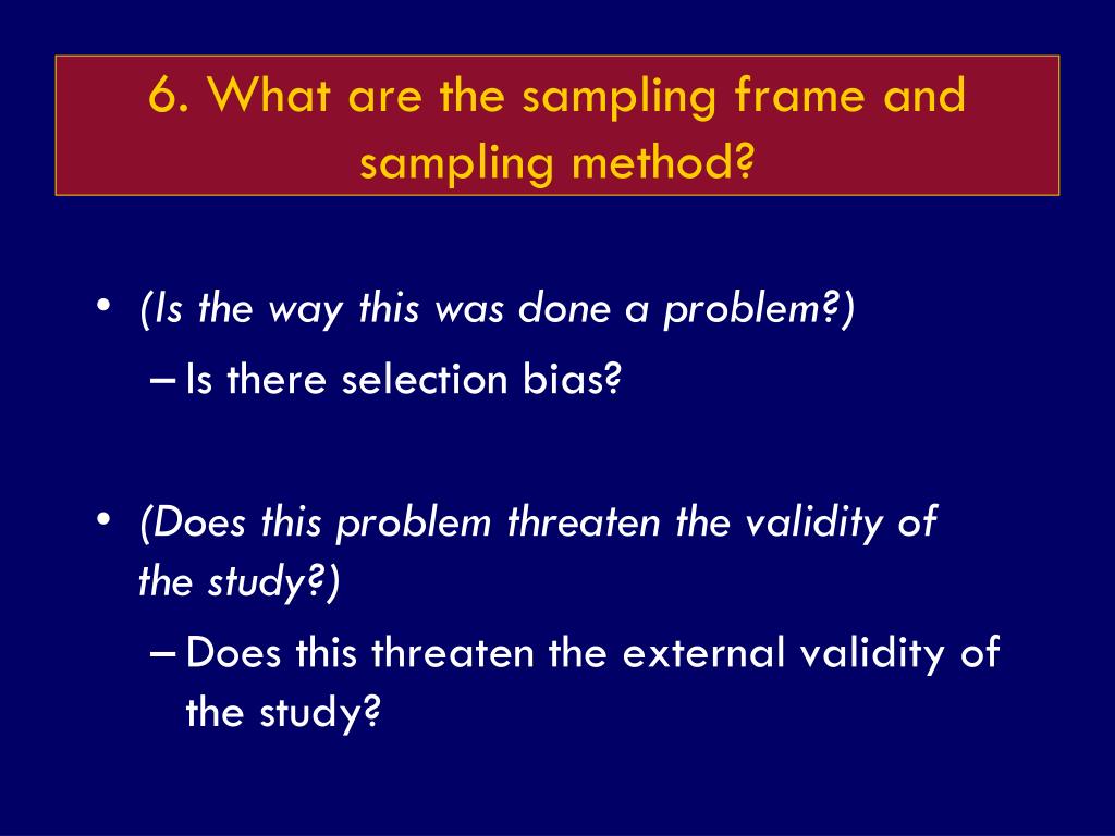 6. What are the sampling frame and sampling method? • (Is the way this was done a problem?) • Is there selection bias? • (Does this problem threaten the validity of the study?) • Does this threaten the external validity of the study?