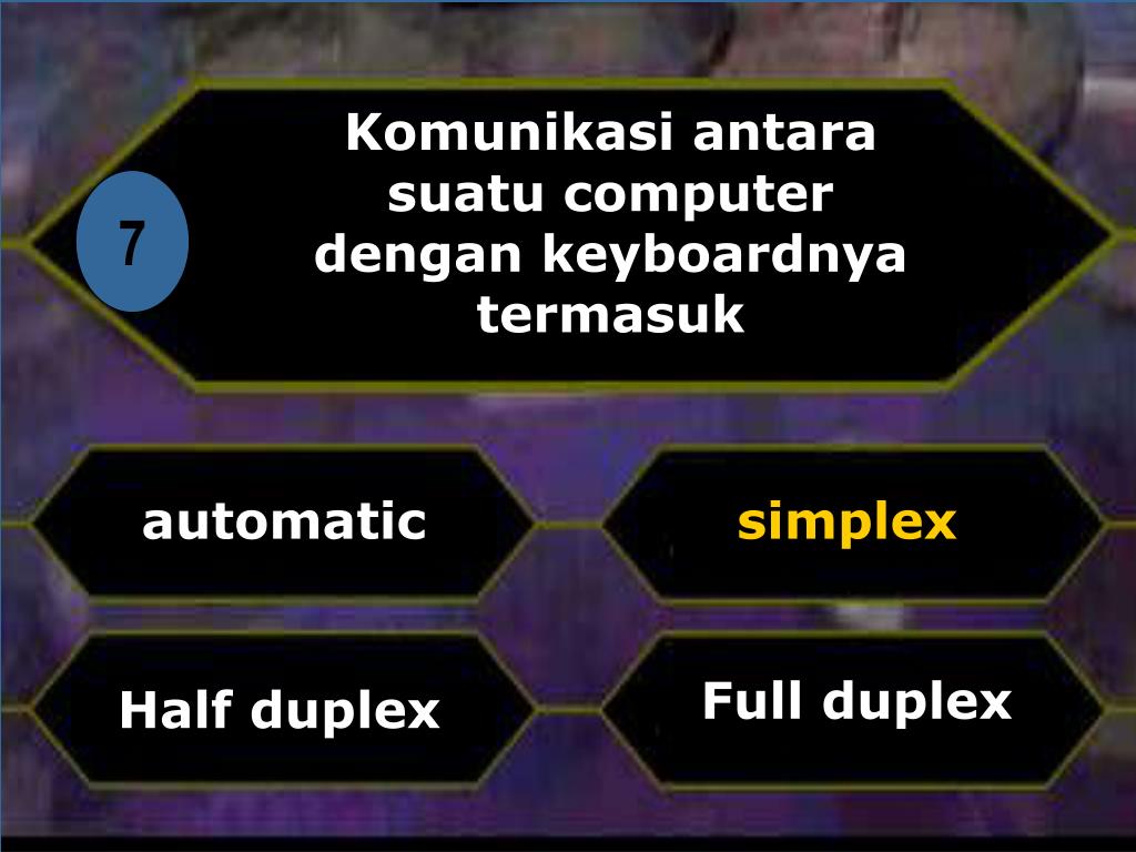 Komunikasi antara suatu computer dengan keyboardnya termasuk Di 7 automatic simplex Full duplex Half duplex