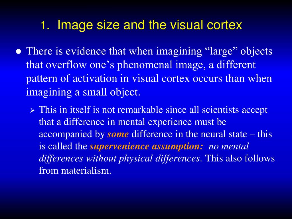 1. Image size and the visual cortex • There is evidence that when imagining “large” objects that overflow one’s phenomenal image, a different pattern of activation in visual cortex occurs than when imagining a small object. • This in itself is not remarkable since all scientists accept that a difference in mental experience must be accompanied by some difference in the neural state – this is called thesupervenience assumption: no mental differences without physical differences. This also follows from materialism.