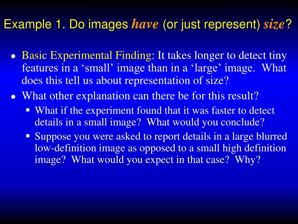 Example 1. Do images have(or just represent) size? • Basic Experimental Finding: It takes longer to detect tiny features in a ‘small’ image than in a ‘large’ image. What does this tell us about representation of size? • What other explanation can there be for this result? • What if the experiment found that it was faster to detect details in a small image? What would you conclude? • Suppose you were asked to report details in a large blurred low-definition image as opposed to a small high definition image? What would you expect in that case? Why?