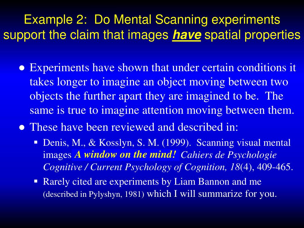 Example 2: Do Mental Scanning experiments support the claim that images have spatial properties • Experiments have shown that under certain conditions it takes longer to imagine an object moving between two objects the further apart they are imagined to be. The same is true to imagine attention moving between them. • These have been reviewed and described in: • Denis, M., & Kosslyn, S. M. (1999). Scanning visual mental images: A window on the mind. Cahiers de Psychologie Cognitive / Current Psychology of Cognition, 18(4), 409-465. • Rarely cited are experiments by Liam Bannon and me (described in Pylyshyn, 1981) which I will summarize for you. A window on the mind!