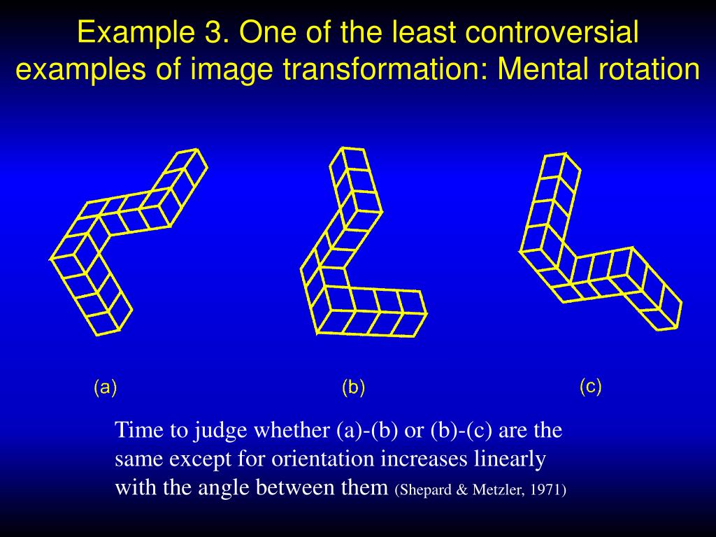 Example 3. One of the least controversial examples of image transformation: Mental rotation Time to judge whether (a)-(b) or (b)-(c) are the same except for orientation increases linearly with the angle between them (Shepard & Metzler, 1971)