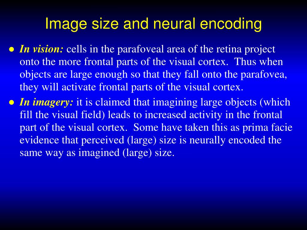 Image size and neural encoding • In vision:cells in the parafoveal area of the retina project onto the more frontal parts of the visual cortex. Thus when objects are large enough so that they fall onto the parafovea, they will activate frontal parts of the visual cortex. • In imagery: it is claimed that imagining large objects (which fill the visual field) leads to increased activity in the frontal part of the visual cortex. Some have taken this as prima facie evidence that perceived (large) size is neurally encoded the same way as imagined (large) size.