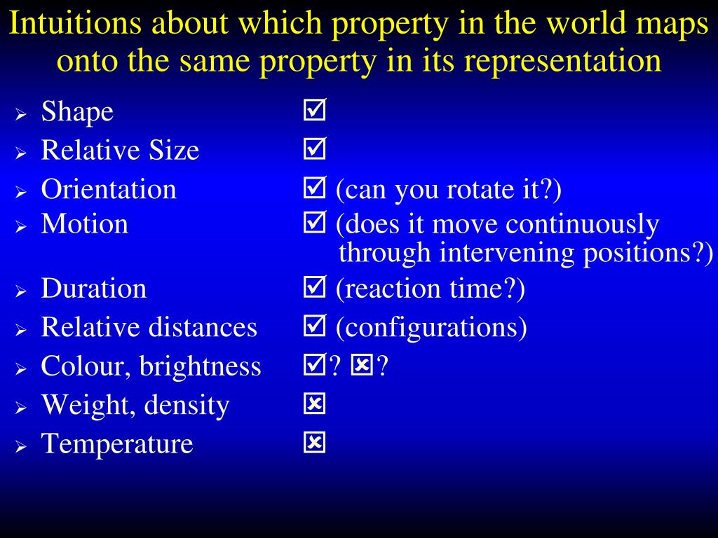 Intuitions about which property in the world maps onto the same property in its representation • Shape • Relative Size • Orientation (can you rotate it?) • Motion (does it move continuously through intervening positions?) • Duration (reaction time?) • Relative distances (configurations) • Colour, brightness ? ? • Weight, density • Temperature