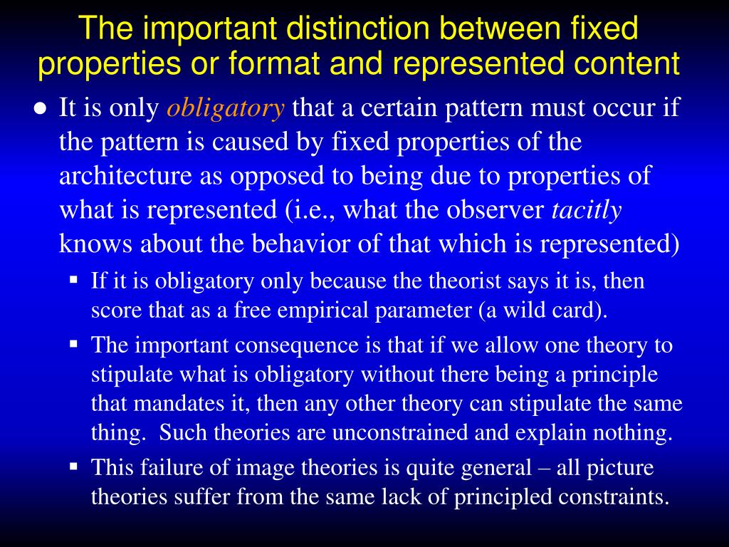 The important distinction between fixed properties or format and represented content • It is only obligatory that a certain pattern must occur if the pattern is caused by fixed properties of the architecture as opposed to being due to properties of what is represented (i.e., what the observer tacitly knows about the behavior of that which is represented) • If it is obligatory only because the theorist says it is, then score that as a free empirical parameter (a wild card). • The important consequence is that if we allow one theory to stipulate what is obligatory without there being a principle that mandates it, then any other theory can stipulate the same thing. Such theories are unconstrained and explain nothing. • This failure of image theories is quite general – all picture theories suffer from the same lack of principled constraints.