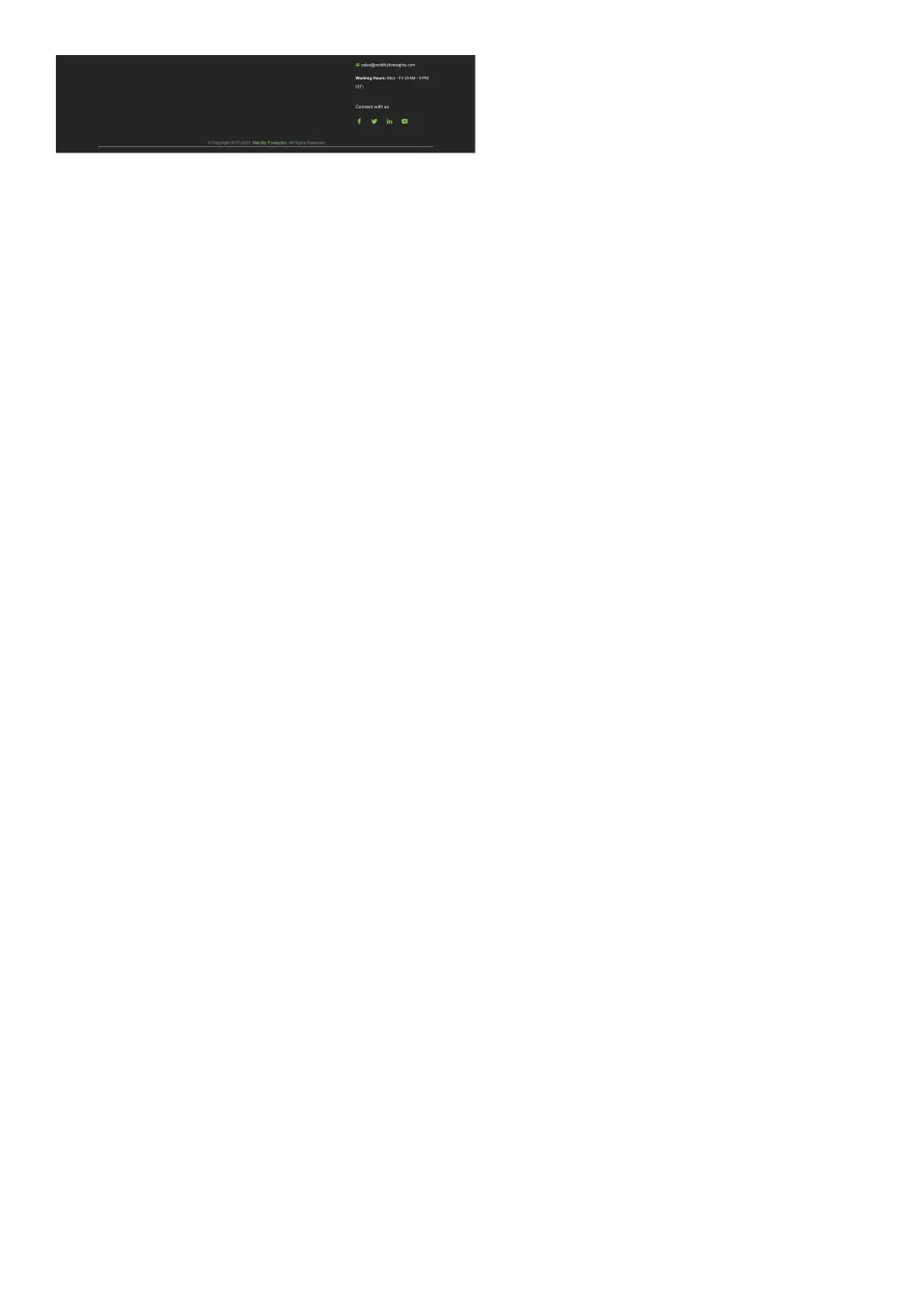 sales@mobilityforesights.com Working Hours: Mon - Fri (9 AM - 9 PM IST) Connect with us © Copyright 2017-2023. Mobility Foresights. All Rights Reserved.