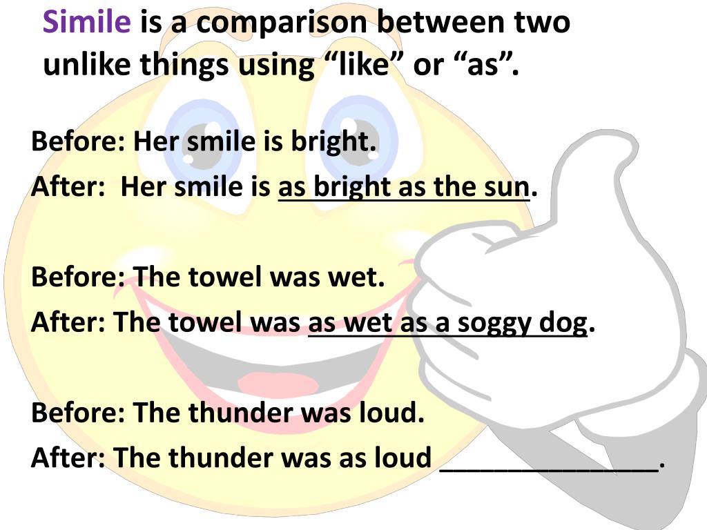 Simile is a comparison between two unlike things using “like” or “as”. Before: Her smile is bright. After: Her smile is as bright as the sun. Before: The towel was wet. After: The towel was as wet as a soggy dog. Before: The thunder was loud. After: The thunder was as loud ________________.