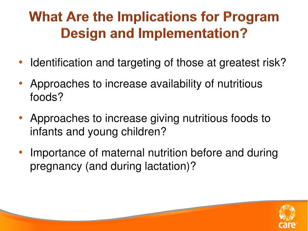 What Are the Implications for Program Design and Implementation? • Identification and targeting of those at greatest risk? • Approaches to increase availability of nutritious foods? • Approaches to increase giving nutritious foods to infants and young children? • Importance of maternal nutrition before and during pregnancy (and during lactation)?