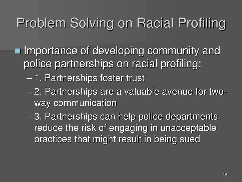 Problem Solving on Racial Profiling • Importance of developing community and police partnerships on racial profiling: • 1. Partnerships foster trust • 2. Partnerships are a valuable avenue for two-way communication • 3. Partnerships can help police departments reduce the risk of engaging in unacceptable practices that might result in being sued