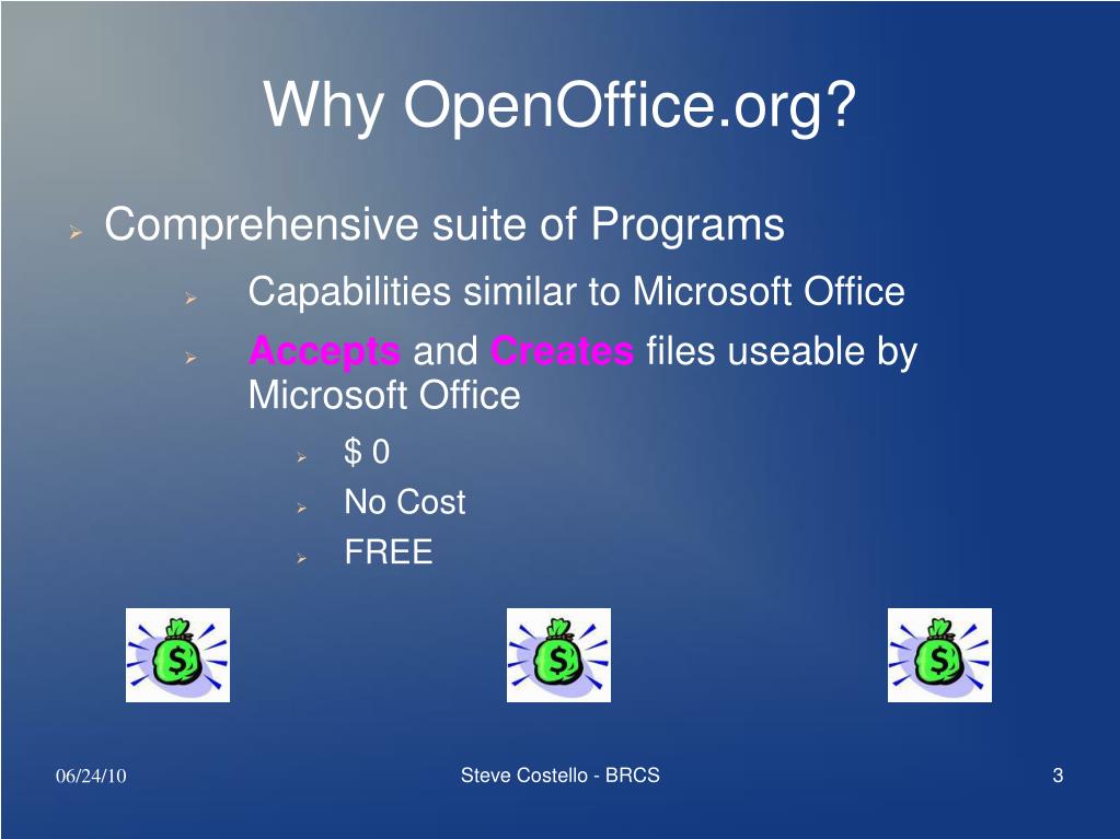 Steve Costello - BRCS Why OpenOffice.org? • Comprehensive suite of Programs • Capabilities similar to Microsoft Office • Accepts and Creates files useable by Microsoft Office • $ 0 • No Cost • FREE