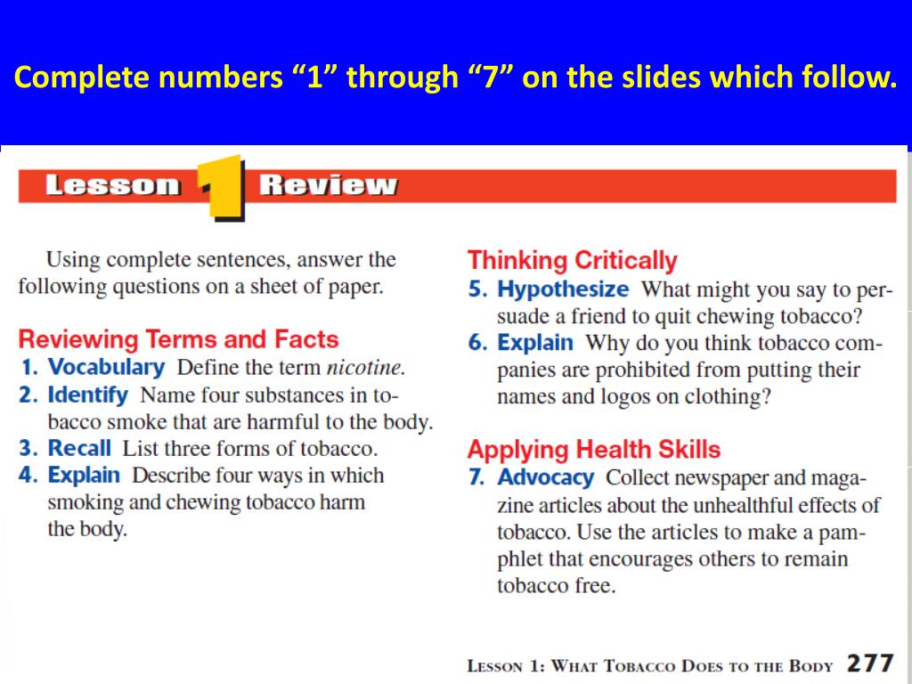 Health (Teen Health 2) Chapter 10 Lesson 1What Tobacco Does to the Body, pp. 272-277Change to your Full NameFirst save in the ‘My Documents’. When finished, submit by saving in the ‘My Documents and closingthe file—leave the name the same. An answer is only half (½) correct without the page number. Note you may copy the questions and write the answers on a sheet of paper rather than complete this online version of the assignment if you prefer. Right click & Open for a presentation on this lesson. Include clipart and custom animation on this slide. Also animate slide transition.