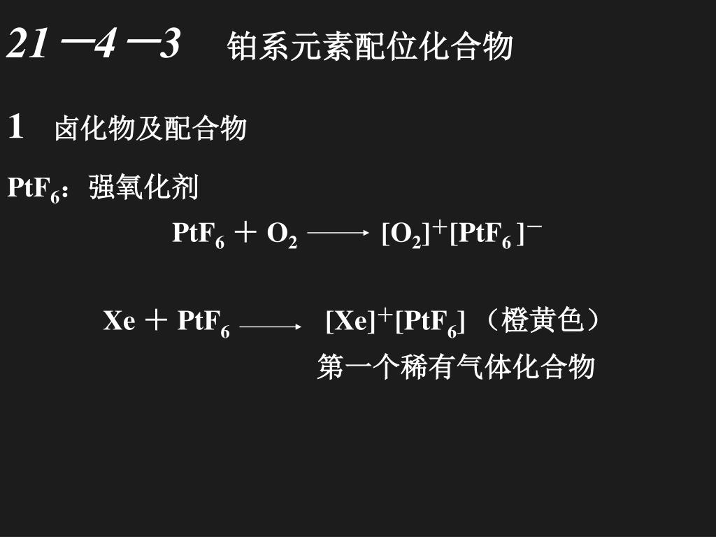 Xe + PtF6 [Xe]+[PtF6] (橙黄色) 第一个稀有气体化合物 21-4-3铂系元素配位化合物 1 卤化物及配合物 PtF6:强氧化剂 PtF6+ O2 [O2]+[PtF6 ]-