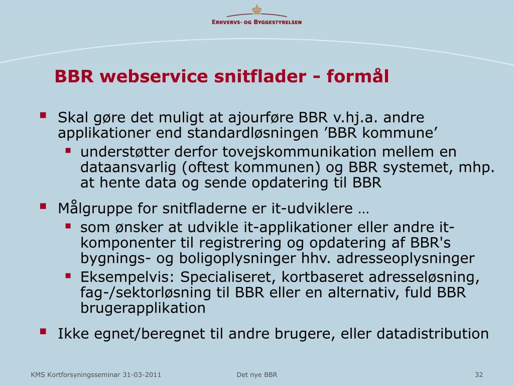 BBR webservice snitflader - formål • Skal gøre det muligt at ajourføre BBR v.hj.a. andre applikationer end standardløsningen ’BBR kommune’ • understøtter derfor tovejskommunikation mellem en dataansvarlig (oftest kommunen) og BBR systemet, mhp. at hente data og sende opdatering til BBR • Målgruppe for snitfladerne er it-udviklere … • som ønsker at udvikle it-applikationer eller andre it-komponenter til registrering og opdatering af BBR's bygnings- og boligoplysninger hhv. adresseoplysninger • Eksempelvis: Specialiseret, kortbaseret adresseløsning, fag-/sektorløsning til BBR eller en alternativ, fuld BBR brugerapplikation • Ikke egnet/beregnet til andre brugere, eller datadistribution Det nye BBR