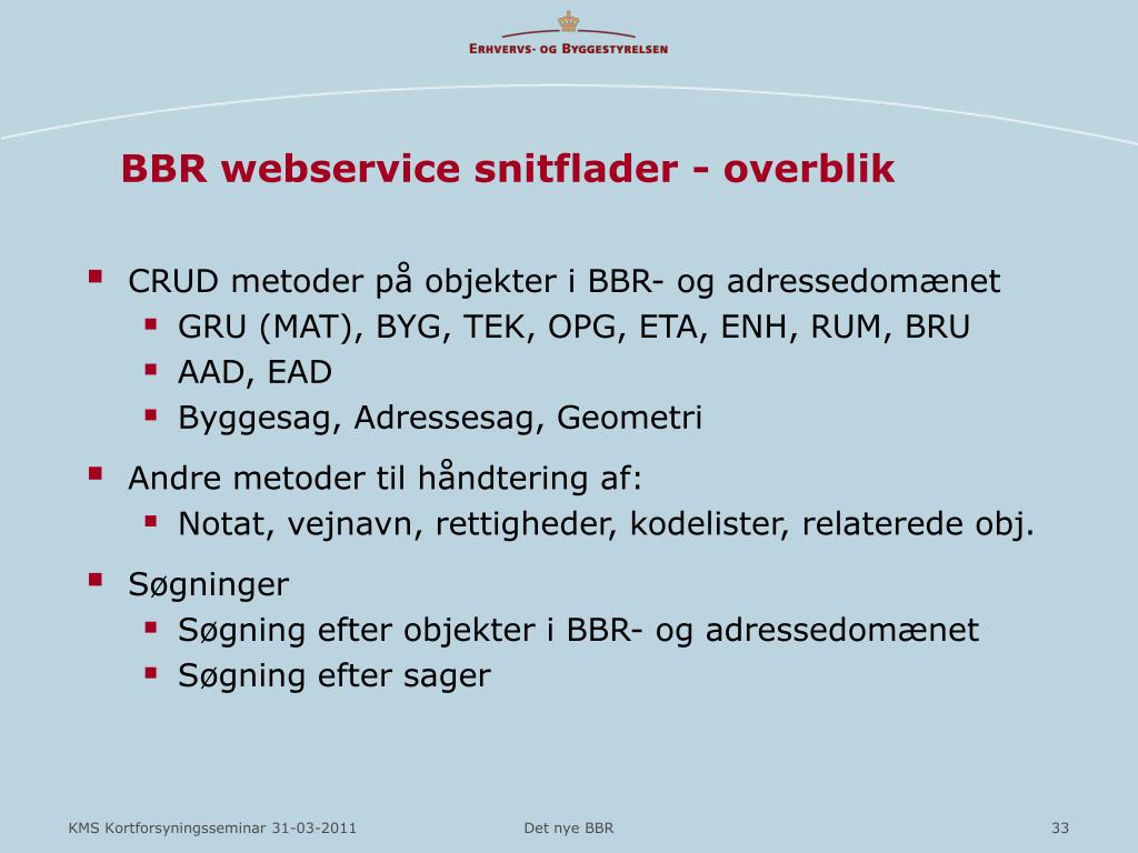 BBR webservice snitflader - overblik • CRUD metoder på objekter i BBR- og adressedomænet • GRU (MAT), BYG, TEK, OPG, ETA, ENH, RUM, BRU • AAD, EAD • Byggesag, Adressesag, Geometri • Andre metoder til håndtering af: • Notat, vejnavn, rettigheder, kodelister, relaterede obj. • Søgninger • Søgning efter objekter i BBR- og adressedomænet • Søgning efter sager Det nye BBR