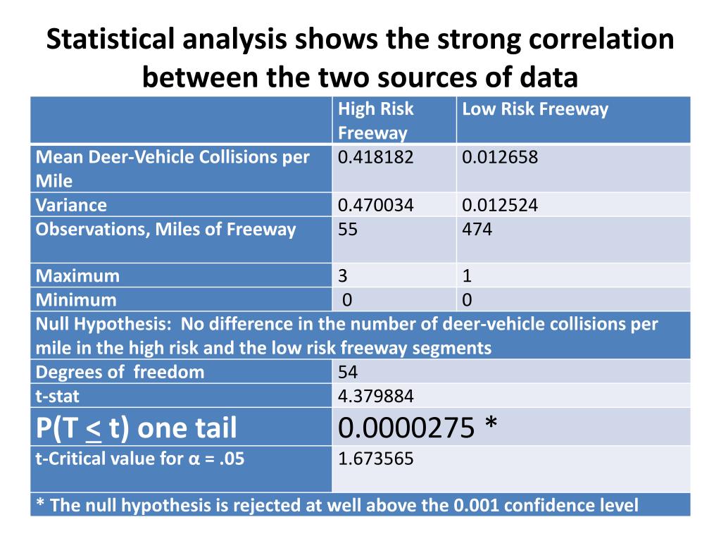 H1: Deer collisions per mile of freeway are higher in the high risk segments Webb, G.K. "Predicting Risk of Deer-Vehicle Collisions Using a Social Media-Based Geographic Information System" (2012) Issues in Information Systems Volume 13, Issue 2. pp. 170-181