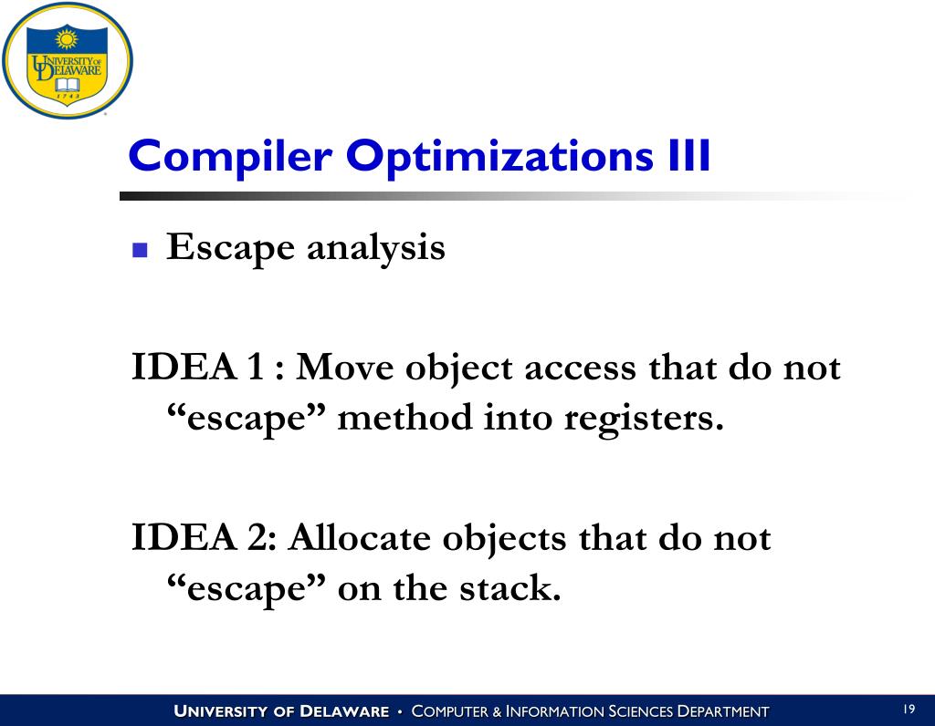 Compiler Optimizations III • Escape analysis IDEA 1 : Move object access that do not “escape” method into registers. IDEA 2: Allocate objects that do not “escape” on the stack.