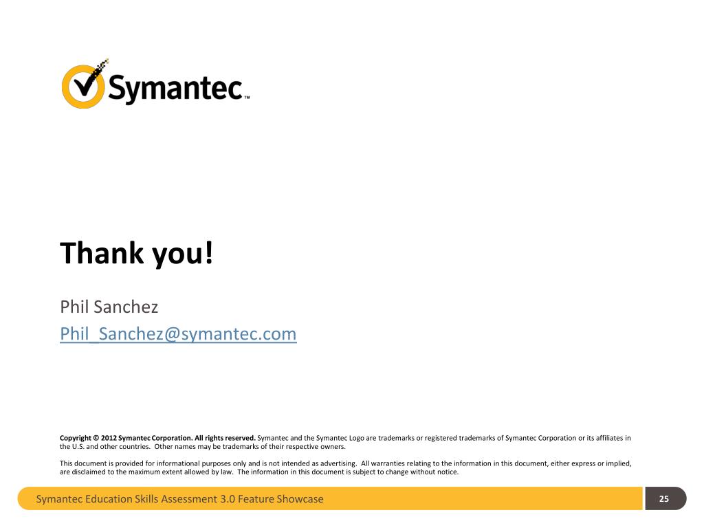 Phil Sanchez Phil_Sanchez@symantec.com Symantec Education Skills Assessment 3.0 Feature Showcase