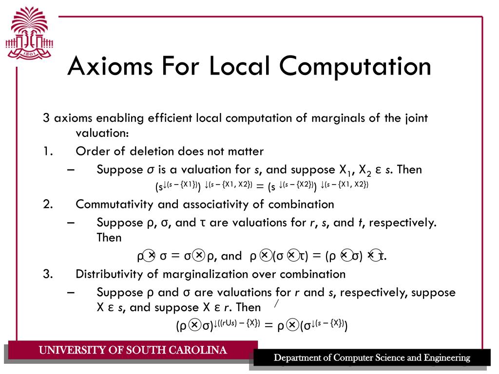 Axioms For Local Computation 3 axioms enabling efficient local computation of marginals of the joint valuation: • Order of deletion does not matter • Suppose σ is a valuation for s, and suppose X1, X2εs. Then (s↓(s – {X1})) ↓(s – {X1, X2}) = (s ↓(s – {X2})) ↓(s – {X1, X2}) • Commutativity and associativity of combination • Suppose ρ, σ, and τ are valuations for r, s, and t, respectively. Then ρ×σ = σ×ρ, and ρ× (σ×τ) = (ρ×σ) ×τ. • Distributivity of marginalization over combination • Suppose ρ and σ are valuations for r and s, respectively, suppose X εs, and suppose X εr. Then (ρ×σ)↓((rUs) – {X}) = ρ× (σ↓(s – {X}))