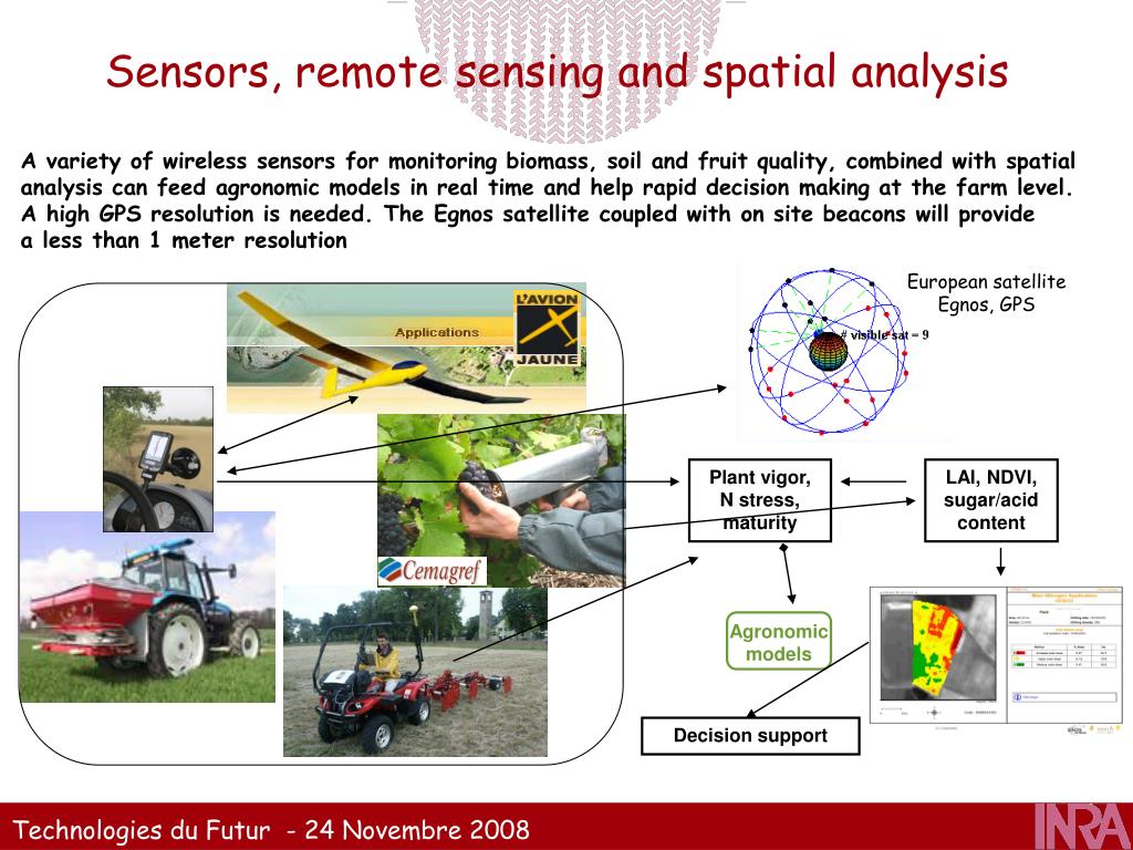 Sensors, remote sensing and spatial analysis Potential applications: Collecting informations Environment monitoring, Nutritional status and epidemiology Surveillance of illicit crops Identification of management mistakes Agronomic model feed with collected data Improvement of model predictions Crop management decision support Precision farming tracking and automatic guiding systems, variable-rate fertilisation water irrigation control in real time Crop protection treatments Optimal harvest conditions Limitations Cost and complexity Part of the collection of data is still hand-based (ex Spectrophotometer) Present GPS resolution is limiting. Cloudy areas are a problem Consulted experts:Jean-Michel Roger,Bruno Tisseyre, Alexia Gobrecht
