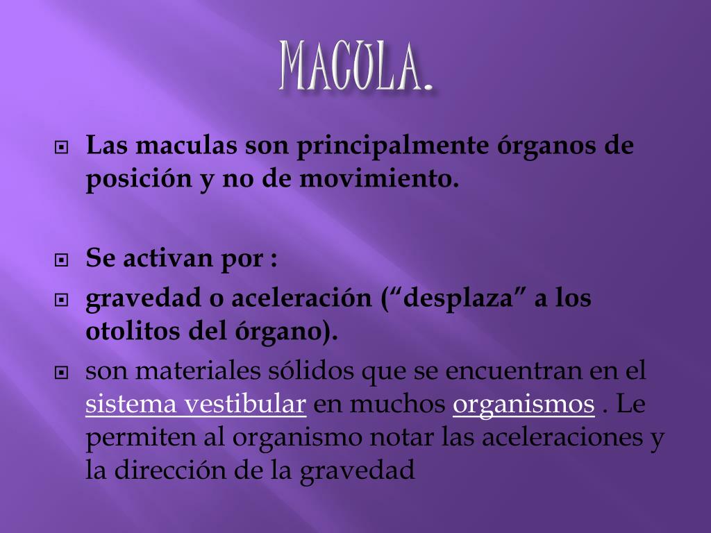 MACULA. Las maculas son principalmente órganos de posición y no de movimiento. Se activan por : gravedad o aceleración (“desplaza” a los otolitos del órgano). son materiales sólidos que se encuentran en el sistema vestibular en muchos organismos . Le permiten al organismo notar las aceleraciones y la dirección de la gravedad