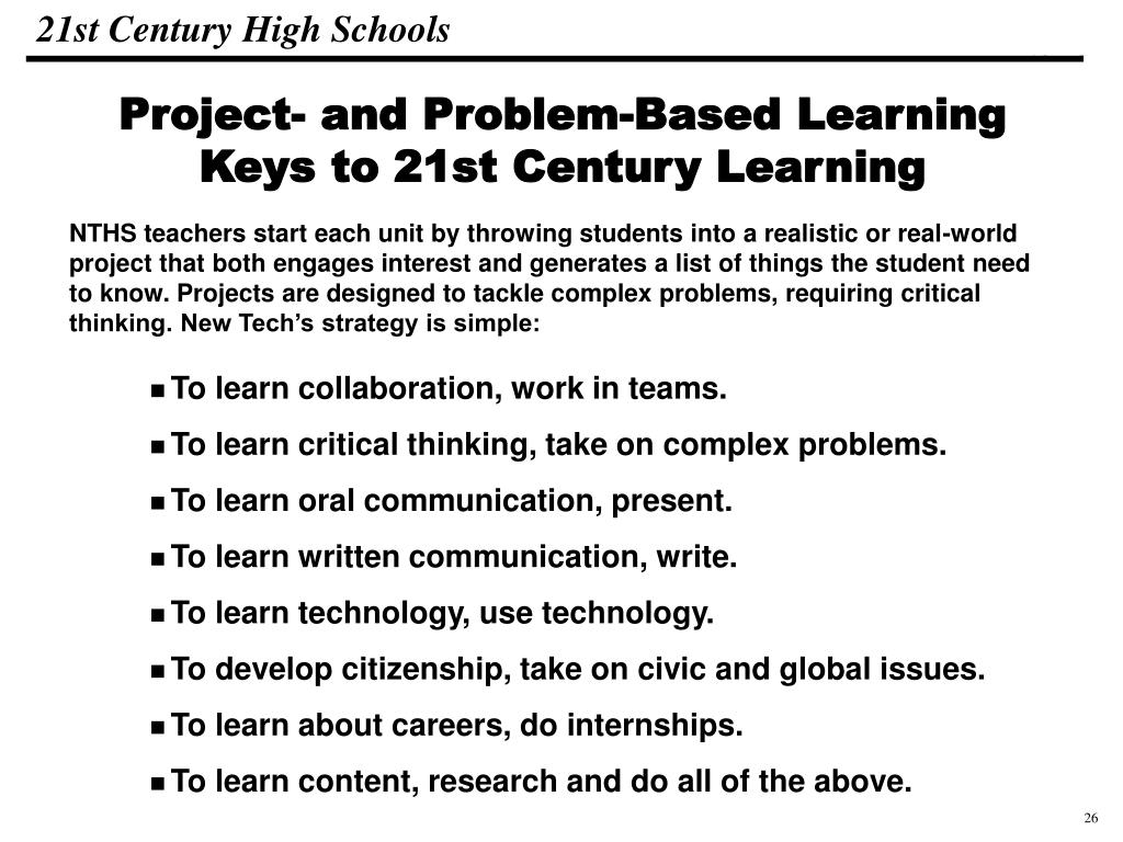 Project- and Problem-Based LearningKeys to 21st Century Learning • To learn collaboration, work in teams. • To learn critical thinking, take on complex problems. • To learn oral communication, present. • To learn written communication, write. • To learn technology, use technology. • To develop citizenship, take on civic and global issues. • To learn about careers, do internships. • To learn content, research and do all of the above. NTHS teachers start each unit by throwing students into a realistic or real-world project that both engages interest and generates a list of things the student need to know. Projects are designed to tackle complex problems, requiring critical thinking. New Tech’s strategy is simple: